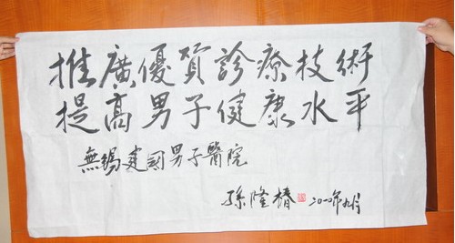 国家卫生部原副部长、全国政协教科文卫体委员会副主任孙隆椿先生利用参加由中国医疗国际交流促进会主办、南通市医学会大力支持、南通广济(男子)医院全权组织承办的“2010中国南通海峡两岸男科学术高峰论坛”的机会,对南通广济(男子)医院的诊疗环境、医院管理、设备建设、专家队伍、服务流程等进行了全面的视察和了解,对南通广济门诊在男科领域所做出的突出业绩给予了很高的评价,他希望南通广济门诊能够在男科医学的发展方面不断进取,百尺竿头更进一步,并欣然命笔为南通广济(男子)医院题词:
